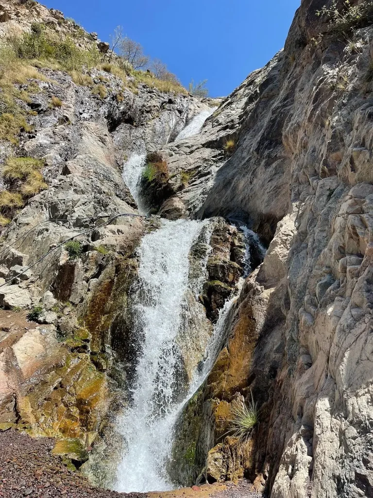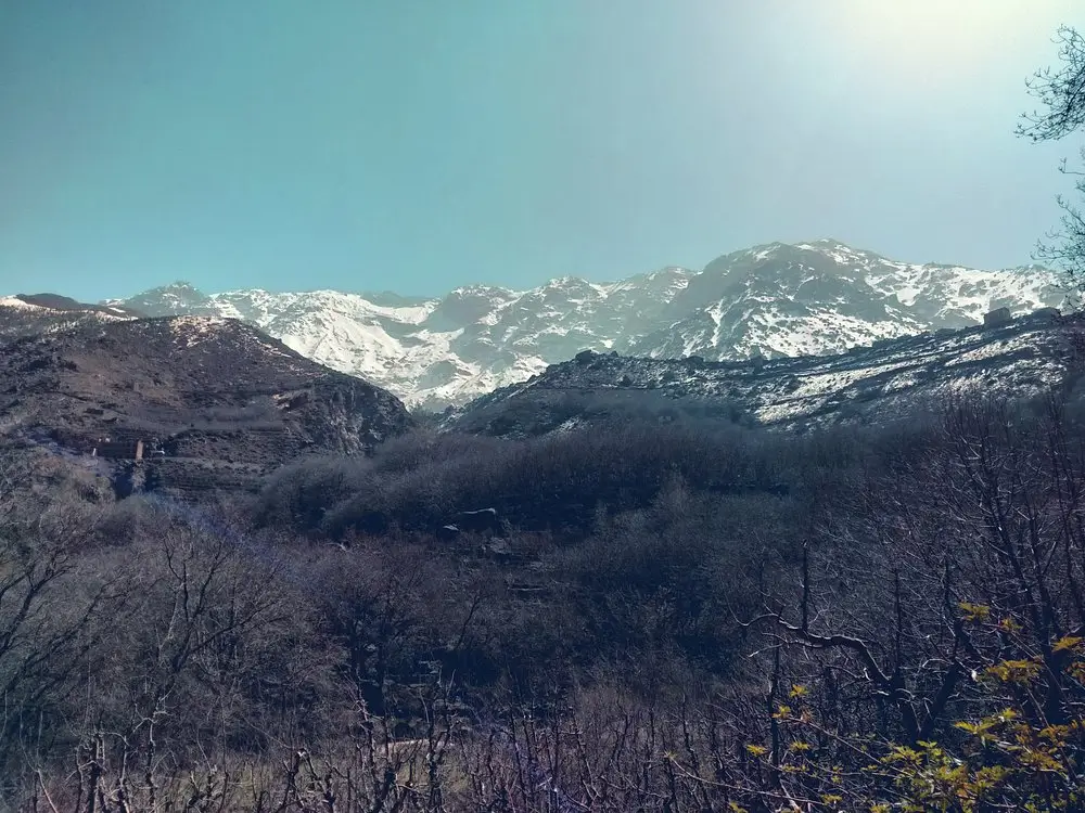 Vue panoramique sur les montagnes du Haut Atlas et cascades locales.