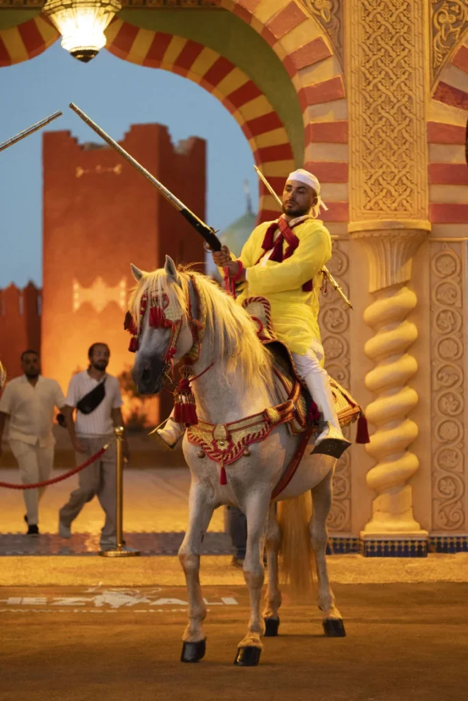 La soirée se poursuit avec le célèbre spectacle Fantasia, où des cavaliers en costumes traditionnels réalisent des démonstrations impressionnantes de poudre et de chevaux, dans une ambiance festive et authentique.